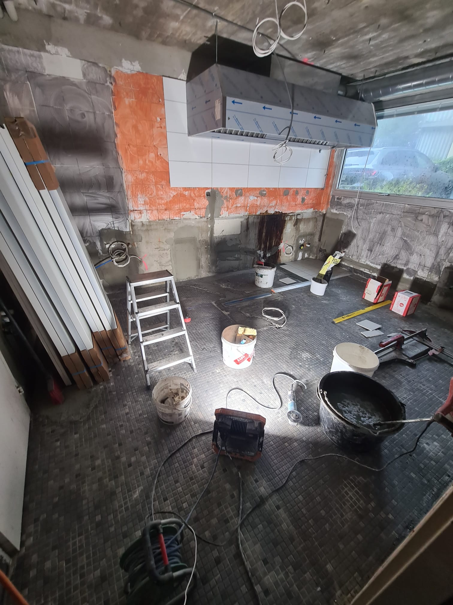 Rénovation complète d’une cuisine professionnel. Pose au sol d’un carrelage grès cérame Pleine masse 20/20 R11 structurer adapter pour la sécurité des cuisines professionnels. Pose aux murs d’un carrelage faïence émaillée 30/60 Facile à l’entretien du nettoyage journalier.