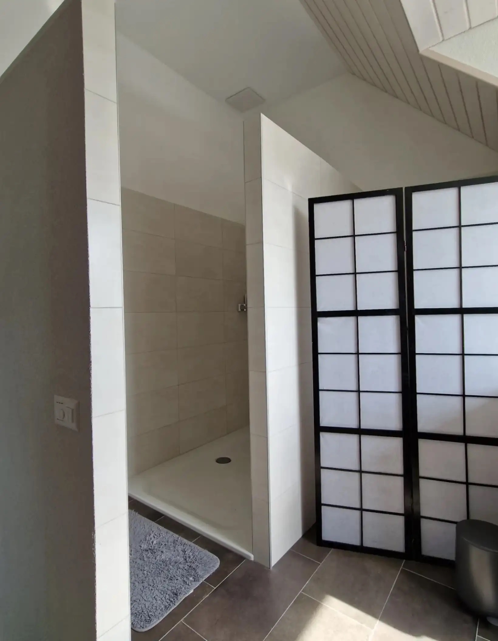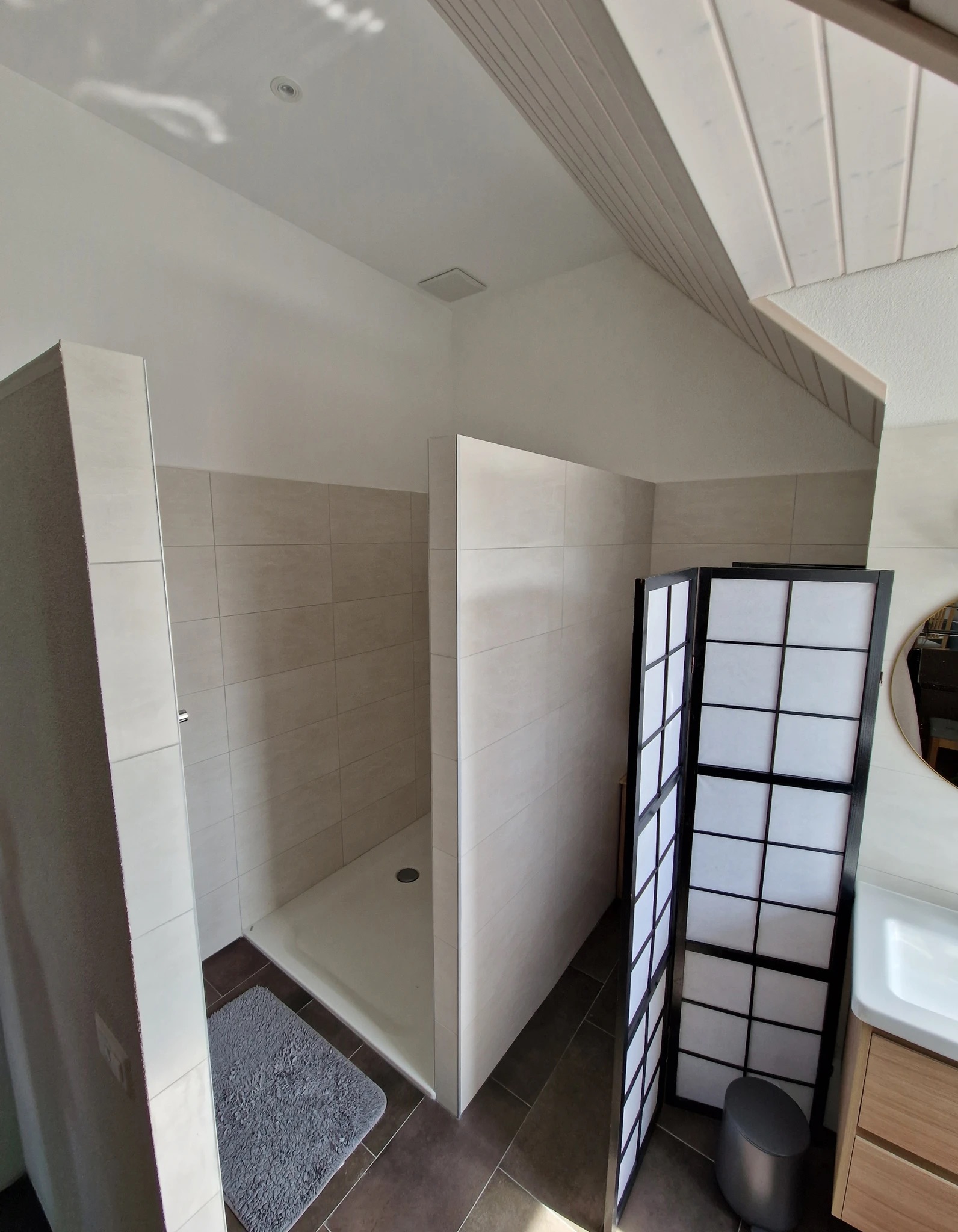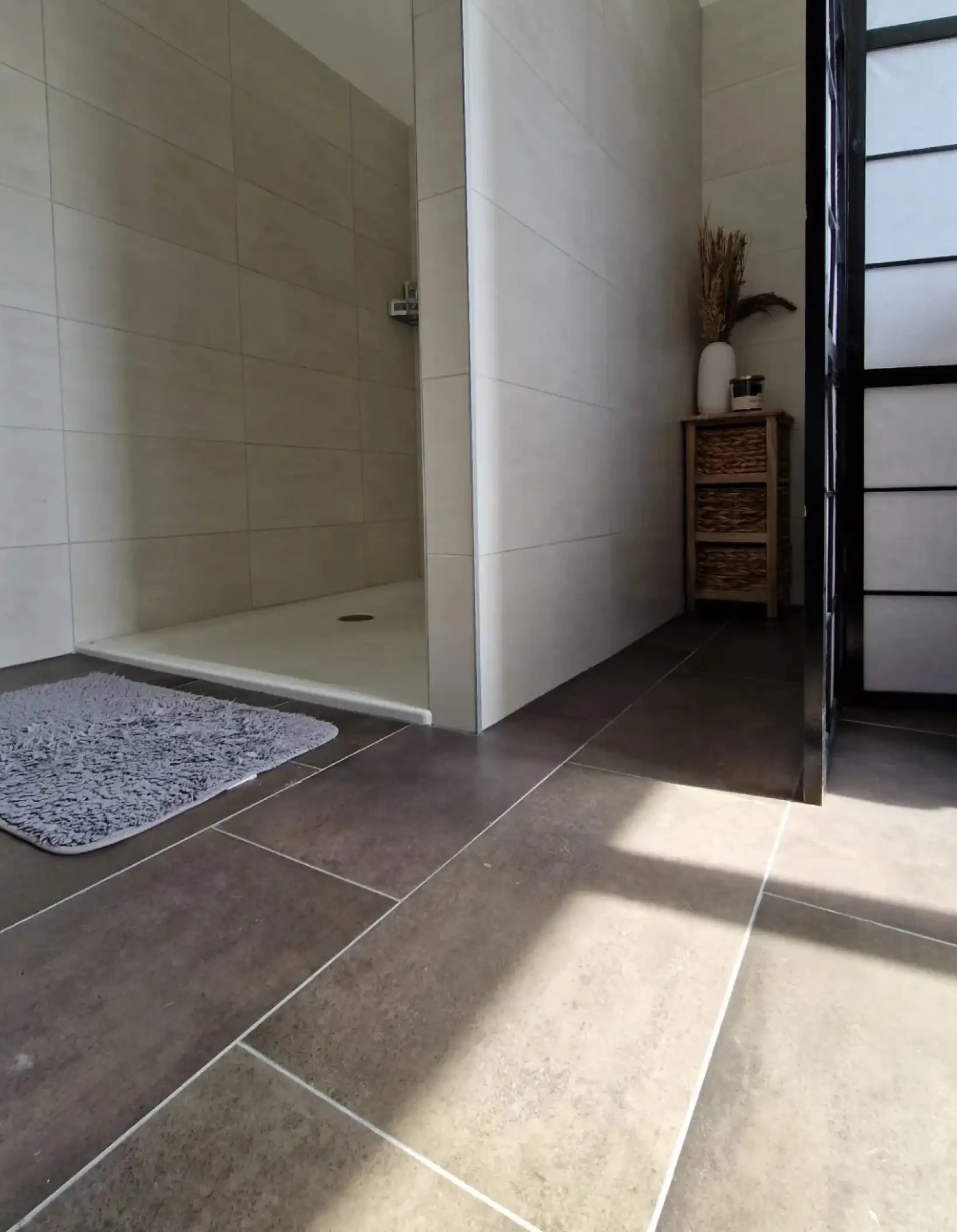 Rénovation et création d’un nouvelle espace de douche. Pose au sol d’un carrelage grès cérame 30/60. Pose aux murs d’un carrelage grès cérame 30/60.